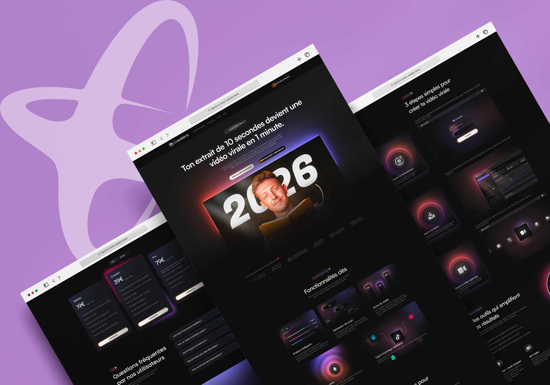 Landing page de conversion pour un SaaS B2C de génération vidéo IA. Positionnement clair, structure de vente orientée bénéfices et tunnel optimisé pour l'acquisition TikTok.