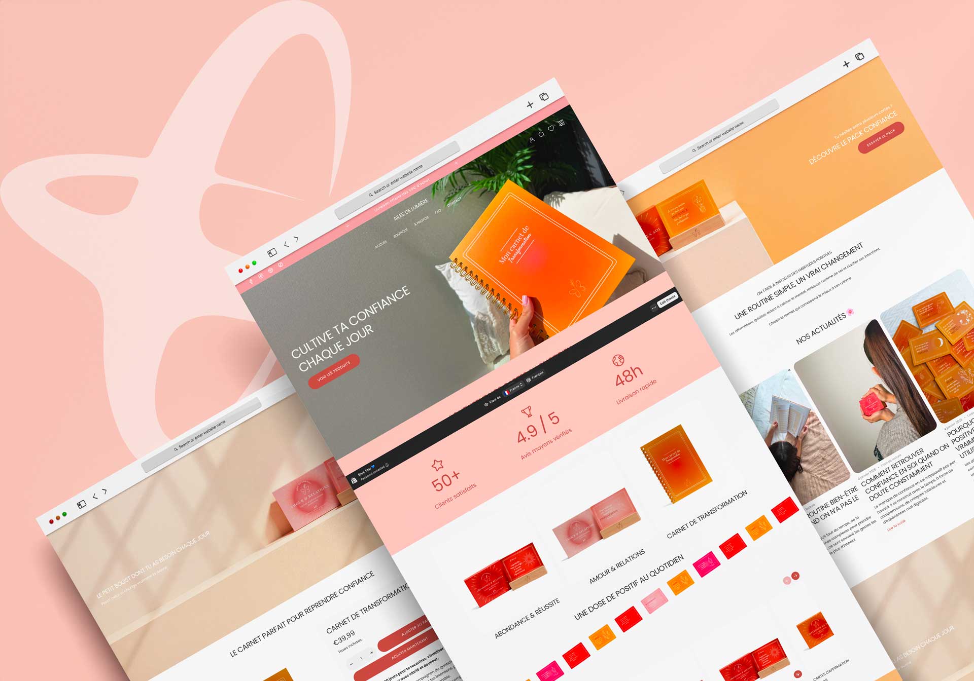 Boutique Shopify complète pour une influenceuse lifestyle (200K abonnés). Design aligné à son univers de marque et tunnel de conversion optimisé pour monétiser son audience.